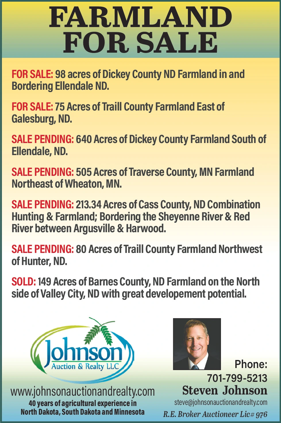 FARMLAND FOR SALE FOR SALE: 98 acres of Dickey County ND Farmland in and Bordering Ellendale ND. FOR SALE: 75 Acres of Traill County Farmland East of Galesburg, ND. SALE PENDING: 640 Acres of Dickey County Farmland South of Ellendale, ND. SALE PENDING: 505 Acres of Traverse County, MN Farmland Northeast of Wheaton, MN. SALE PENDING: 213.34 Acres of Cass County, ND Combination Hunting & Farmland; Bordering the Sheyenne River & Red River between Argusville & Harwood. SALE PENDING: 80 Acres of Traill County Farmland Northwest of Hunter, ND. SOLD: 149 Acres of Barnes County, ND Farmland on the North side of Valley City, ND with great developement potential. Johnson Auction & Realty LLC www.johnsonauctionandrealty.com 40 years of agricultural experience in North Dakota, South Dakota and Minnesota Phone: 701-799-5213 Steven Johnson steve@johnsonauctionandrealty.com R.E. Broker Auctioneer Lic# 976 FARMLAND FOR SALE FOR SALE : 98 acres of Dickey County ND Farmland in and Bordering Ellendale ND . FOR SALE : 75 Acres of Traill County Farmland East of Galesburg , ND . SALE PENDING : 640 Acres of Dickey County Farmland South of Ellendale , ND . SALE PENDING : 505 Acres of Traverse County , MN Farmland Northeast of Wheaton , MN . SALE PENDING : 213.34 Acres of Cass County , ND Combination Hunting & Farmland ; Bordering the Sheyenne River & Red River between Argusville & Harwood . SALE PENDING : 80 Acres of Traill County Farmland Northwest of Hunter , ND . SOLD : 149 Acres of Barnes County , ND Farmland on the North side of Valley City , ND with great developement potential . Johnson Auction & Realty LLC www.johnsonauctionandrealty.com 40 years of agricultural experience in North Dakota , South Dakota and Minnesota Phone : 701-799-5213 Steven Johnson steve@johnsonauctionandrealty.com R.E. Broker Auctioneer Lic # 976
