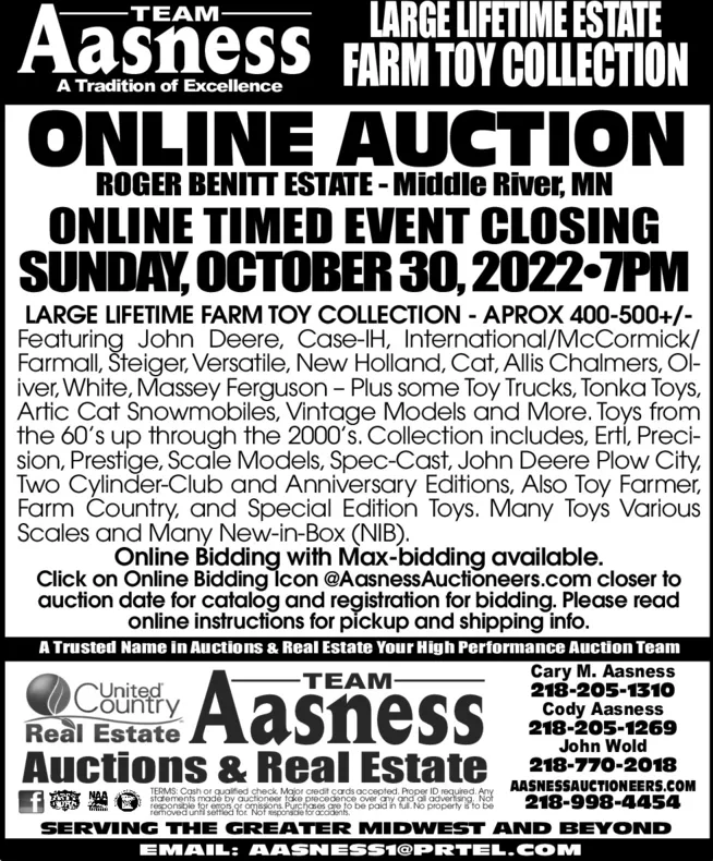 Aasness A Tradition of Excellence LARGE LIFETIME ESTATE FARM TOY COLLECTION ONLINE AUCTION ROGER BENITT ESTATE - Middle River, MN ONLINE TIMED EVENT CLOSING SUNDAY, OCTOBER 30, 2022-7PM LARGE LIFETIME FARM TOY COLLECTION - APROX 400-500+/- Featuring John Deere, Case-IH, International/McCormick/ Farmall, Steiger, Versatile, New Holland, Cat, Allis Chalmers, Ol- iver, White, Massey Ferguson - Plus some Toy Trucks, Tonka Toys, Artic Cat Snowmobiles, Vintage Models and More. Toys from the 60's up through the 2000's. Collection includes, Ertí, Preci- sion, Prestige, Scale Models, Spec-Cast, John Deere Plow City, Two Cylinder-Club and Anniversary Editions, Also Toy Farmer, Farm Country, and Special Edition Toys. Many Toys Various Scales and Many New-in-Box (NIB). Online Bidding with Max-bidding available. Click on Online Bidding Icon @Aasness Auctioneers.com closer to auction date for catalog and registration for bidding. Please read online instructions for pickup and shipping info. A Trusted Name in Auctions & Real Estate Your High Performance Auction Team Cary M. Aasness 218-205-1310 Cody Aasness 218-205-1269 John Wold Auctions & Real Estate 218-770-2018 AASNESSAUCTIONEERS.COM 218-998-4454 United Real Estate Aasness TERMS: Cash or qualified check Major credit cards accepted. Proper ID required. Any statements made by auctioneer take precedence over any and all advertising, Not responsible for emon or omissions Purchases are to be paid in full. No property to be removed until settled for Not responsible for accidents. SERVING THE GREATER MIDWEST AND BEYOND AASNESS1@PRTEL.COM EMAIL: Aasness A Tradition of Excellence LARGE LIFETIME ESTATE FARM TOY COLLECTION ONLINE AUCTION ROGER BENITT ESTATE - Middle River , MN ONLINE TIMED EVENT CLOSING SUNDAY , OCTOBER 30 , 2022-7PM LARGE LIFETIME FARM TOY COLLECTION - APROX 400-500 +/ Featuring John Deere , Case - IH , International / McCormick / Farmall , Steiger , Versatile , New Holland , Cat , Allis Chalmers , Ol iver , White , Massey Ferguson - Plus some Toy Trucks , Tonka Toys , Artic Cat Snowmobiles , Vintage Models and More . Toys from the 60's up through the 2000's . Collection includes , Ertí , Preci sion , Prestige , Scale Models , Spec - Cast , John Deere Plow City , Two Cylinder - Club and Anniversary Editions , Also Toy Farmer , Farm Country , and Special Edition Toys . Many Toys Various Scales and Many New - in - Box ( NIB ) . Online Bidding with Max - bidding available . Click on Online Bidding Icon @Aasness Auctioneers.com closer to auction date for catalog and registration for bidding . Please read online instructions for pickup and shipping info . A Trusted Name in Auctions & Real Estate Your High Performance Auction Team Cary M. Aasness 218-205-1310 Cody Aasness 218-205-1269 John Wold Auctions & Real Estate 218-770-2018 AASNESSAUCTIONEERS.COM 218-998-4454 United Real Estate Aasness TERMS : Cash or qualified check Major credit cards accepted . Proper ID required . Any statements made by auctioneer take precedence over any and all advertising , Not responsible for emon or omissions Purchases are to be paid in full . No property to be removed until settled for Not responsible for accidents . SERVING THE GREATER MIDWEST AND BEYOND AASNESS1@PRTEL.COM EMAIL :